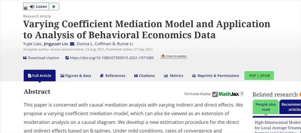 近日,厦门大学经济学院统计学与数据科学系刘婧媛教授与宾夕法尼亚州立大学廖予婕博士(厦大经济学科本科毕业)、天普大学Donna L. Coffman副教授以及宾夕法尼亚州立大学Runze Li教授合作的论文“Varying Coefficient Mediation Model and Application to Analysis of Behavioral Economics Data”,在统计学与计量经济学国际权威期刊Journal of Business & Economic Statistics在线发表。